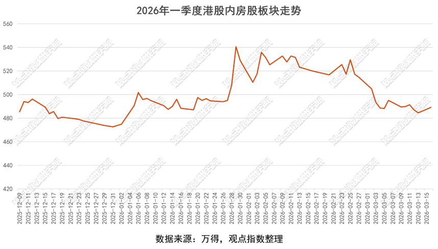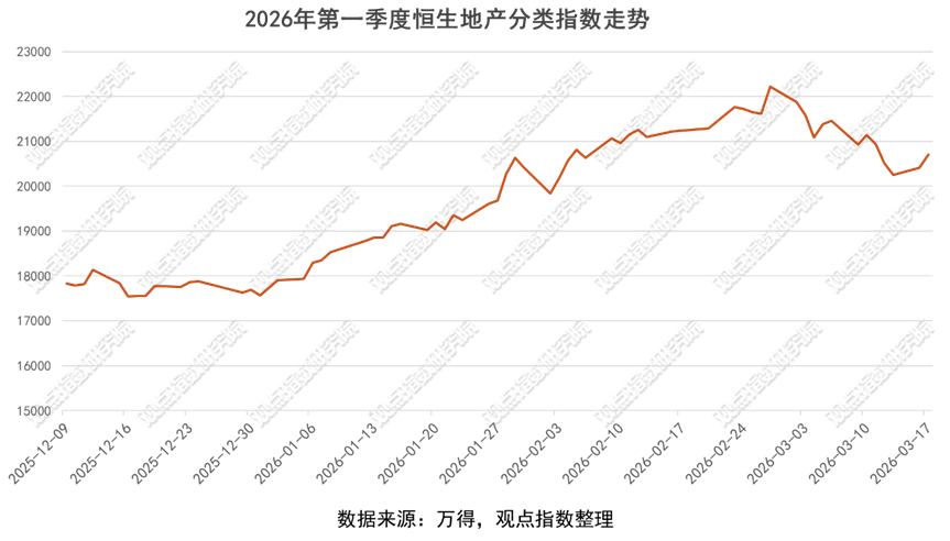 整体来看,一季度恒生地产分类指数的上行行情由港资头部房企主导,高相关性标的带动板块估值修复,资金聚焦优质龙头标的,内房企及商业地产标的涨幅相对平缓,板块轮动特征明显,3月份初受美伊冲突升级影响,出现高位回调、指数有所回落,但核心龙头标的支撑仍在,一季度港股地产板块整体实现开门红,复苏趋势逐步明朗。