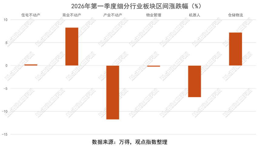 物业管理板块四季度跌幅5.38%,一季度收窄至-0.23%接近止跌,机器人板块四季度跌幅10.89%,一季度收窄至-6.89%下行压力缓解,仓储物流板块四季度仅小幅下跌3.72%,一季度凭借强劲外贸数据支撑大涨7.20%,物流周转需求回升、供应链活跃度提升成为其走强的核心动力。整体而言,不动产赛道呈现“强分化、弱修复”的特征,消费及物流相关板块率先反弹,产业关联板块仍处于磨底阶段。
