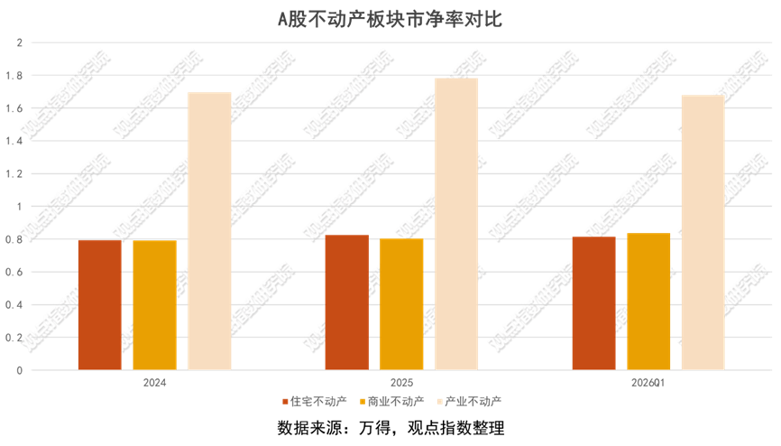 产业不动产市净率显著高于住宅与商业板块,住宅与商业估值低位平稳。2026Q1 商业小幅抬升、住宅与产业略有回落。产业不动产受益于产业园、物流仓储等高现金流资产需求,资产质量与盈利确定性更强,估值持续领跑;住宅受销售弱复苏、资产减值压力影响,估值维持低位窄幅波动;商业不动产随消费回暖与商业不动线 REITs 申报利好刺激,2026Q1 估值小幅修复,但整体仍低于产业板块。