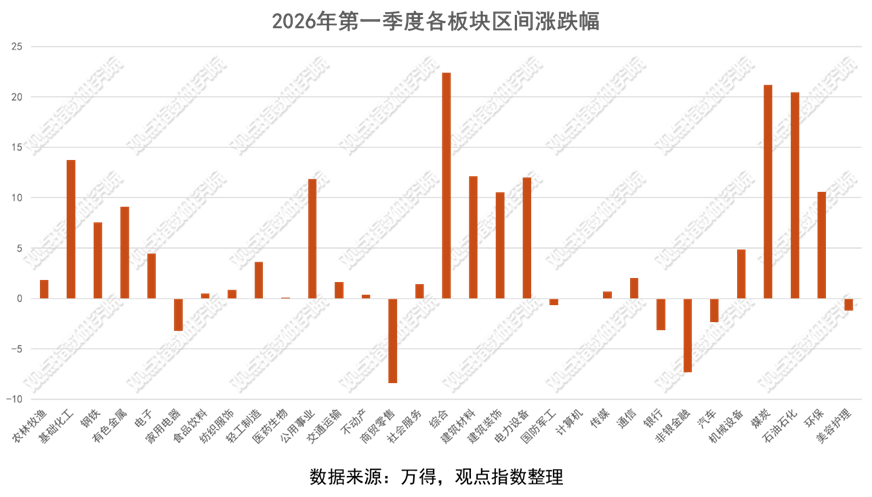 一季度申万31个一级行业走势分化显著:煤炭、石油石化板块领涨,涨幅均超20%;商贸零售、非银金融、家用电器板块跌幅居前,均跌超3%。整体来看,31个行业中20个上涨、11个下跌,周期与资源类板块表现强势,消费、金融及部分科技板块表现偏弱。